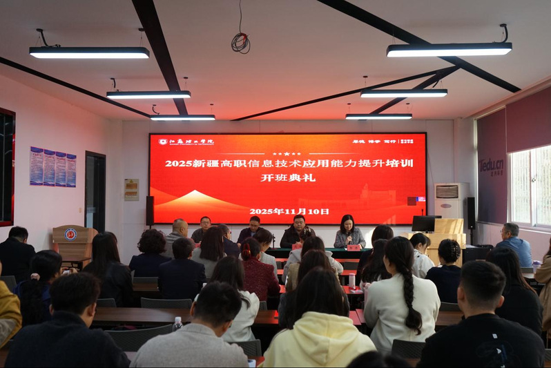 11月10日,2025新疆维吾尔自治区高职国培信息技术应用能力提升项目在我校开班。江苏理工学院计算机工程学院副院长汤嘉立、计算机工程学院培训与职业教育中心主任高伟、项目管理人员郭丹、薛小锋以及来自新疆维吾尔自治区的47名高职骨干教师参加了开班典礼。开班典礼由高伟主持。