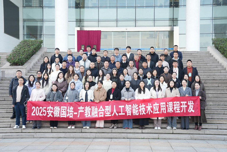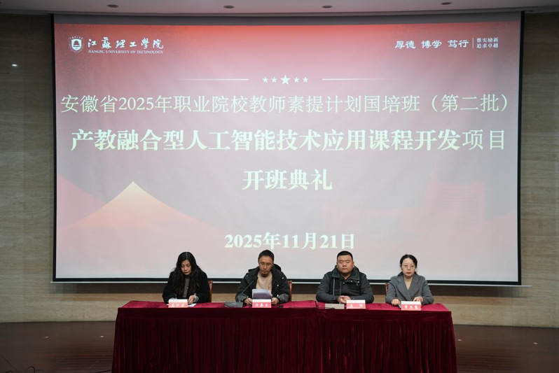 2025年11月21日,安徽省2025年职业院校教师素质提高计划国家级培训(第二批)产教融合型人工智能技术应用课程开发培训项目开班典礼在江苏理工学院图书馆北报告厅隆重举行。计算机工程学院教学院长兼项目教学质量监督汤嘉立、计算机工程学院培训与职业教育中心主任高伟、项目负责人常玉慧出席,来自安徽省70多所中高职院校的77名骨干教师参加典礼,开班典礼由高伟主持。