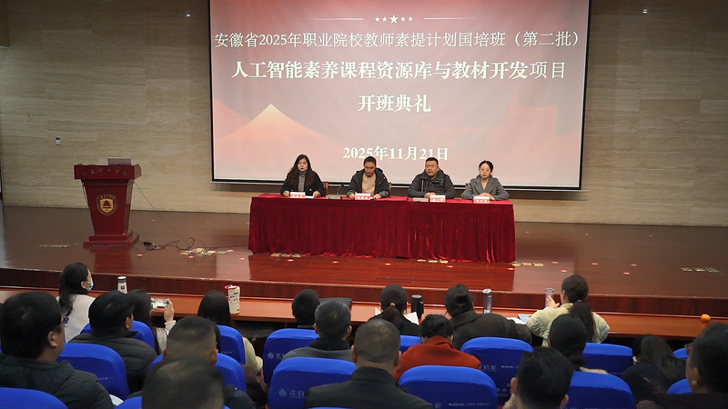 2025年11月21日,安徽省2025年职业院校教师素质提高计划国培班(第二批)人工智能素养课程资源库与教材开发项目开班典礼在江苏理工学院北报告厅隆重举行。计算机工程学院教学院长兼项目教学质量监督汤嘉立,计算机工程学院培训与职业教育中心主任高伟,项目负责人蔡秋茹以及来自安徽省中高职院校的76名骨干教师参加典礼,开班仪式由高伟主持。